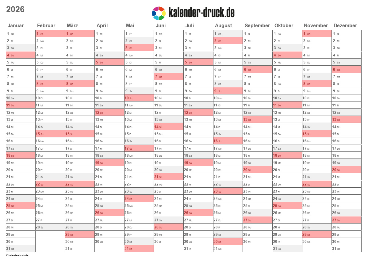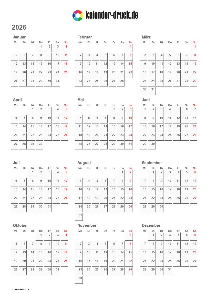 Als kostenlosen Service bieten wir Ihnen hier aktuelle Kalender und Jahresplaner für das Jahr 2025 und 2026 zum Download an. Die Kalender sind Einblattkalender im A4 Format, die Sie ganz unkompliziert auf Ihrem A4- oder A3-Drucker selbst ausdrucken können. Die Kalender eignen sich als Jahresüberblick an der Wand oder als Terminplaner auf dem Schreibtisch.